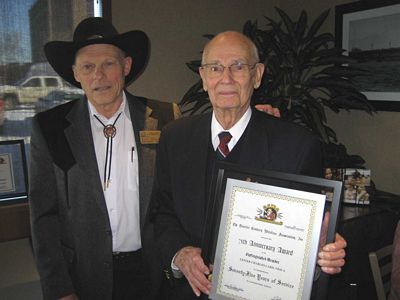 Left to right - President Ken Oelke, VE6AFO presents Les Card, VE6CA his 75-Year Award
