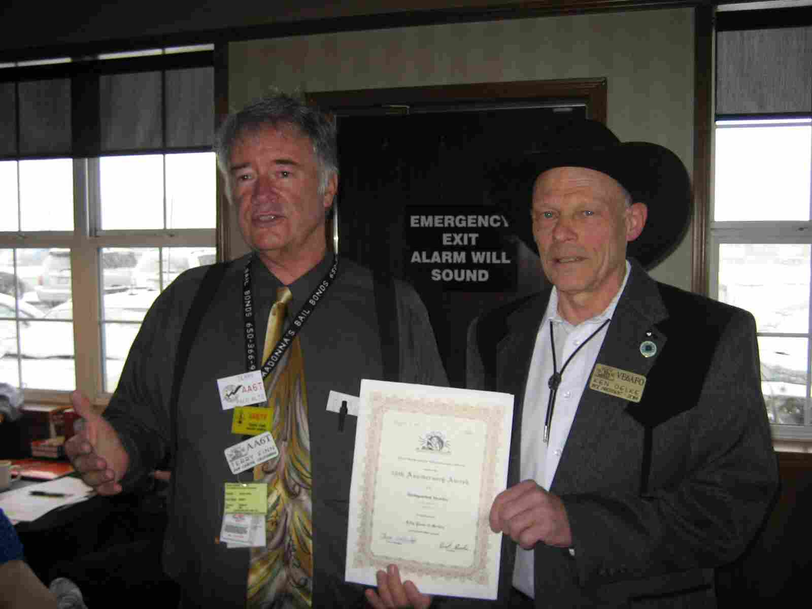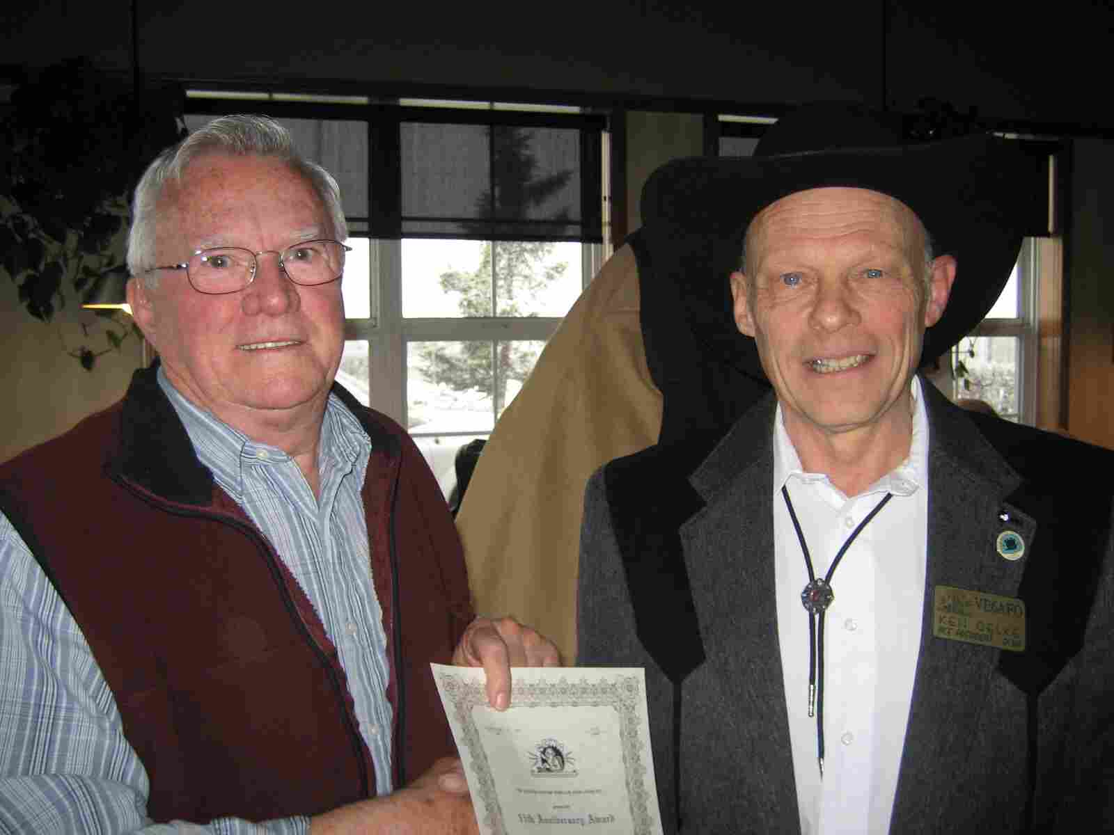 Left to right - Terry Finn (VA6TF) presents Ken Oelke (VE6AFO) with his 50-Year Award.