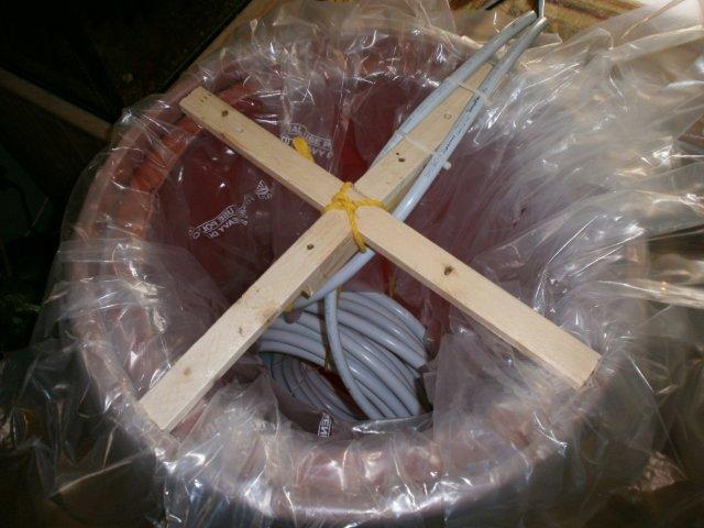 - The Tank is a rain barrel which i had lying around. 50 US Gal. I had lined it with plastic. And is sitting on foam pad (using 2x2's to strengthen). It has a foam top, no insulation on the sides yet.