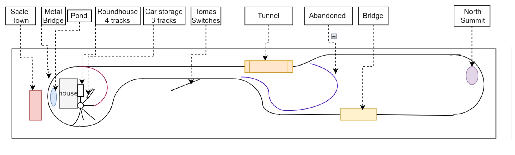 The railroad was built in the following phases - phase 1 - track between the deck and the south bridge - phase 2 - complete the loop around the house - phase 3 - build the roundhouse and switch servicing 2 lines it to the main line - phase 4 - track expansion north dog bone - phase 5 - installation of fence and wooden track at north end - phase 6 - tunnel installation near north end - phase 7 - turntable installation to access round house - phase 8 - switches to connect the short loop around the house (not complete) - phase 9 - installation of scale train storage shed - phase 10 - extend north loop to front of property *north Summit 0 Cabin switch 58 signal 77.5 bench 113 minished 144 industry switch 270.5 signals box done 323 east side of wooden train 380.5 middle of bridge 478.5 solar cam done 521.5 north summit 606.5 metal wheel done 727 abandoned line 773.5 middle of tunnel done 845.5 flashing orange 888.5 extra wires should move signalbox here 952.5 switch 1014.5 dino bridge middle 1059 grain elevator 1092.5 main switch again