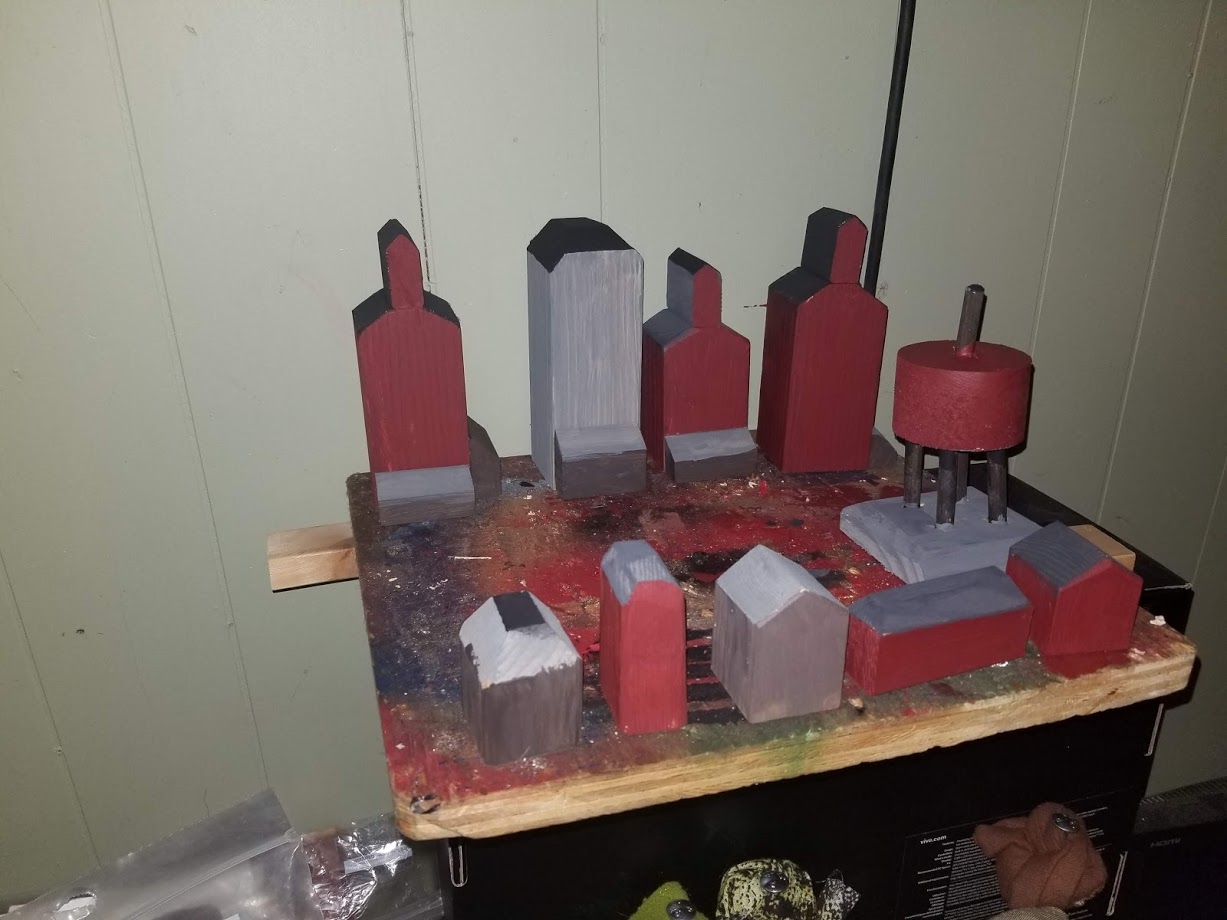 At the bottom we have our wooden layout with handmade wooden buildings, mountains and fabric trees.